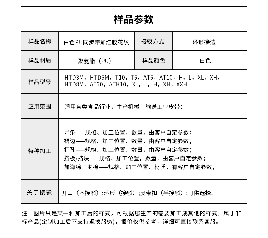 備注:PU同步帶加綠布圖片只是某一種加工后的樣式,可根據(jù)您生產(chǎn)的需要加工成其他的樣式,屬于非標產(chǎn)品(定制加工后不支持退換服務(wù)),報價僅供參考,詳細可直接聯(lián)系客服。