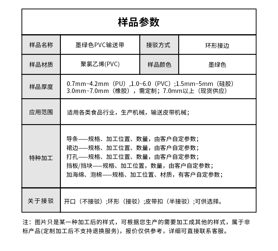 | 樣品名稱 | 墨綠色PVC輸送帶 | 接駁方式 | 環(huán)形接邊 |