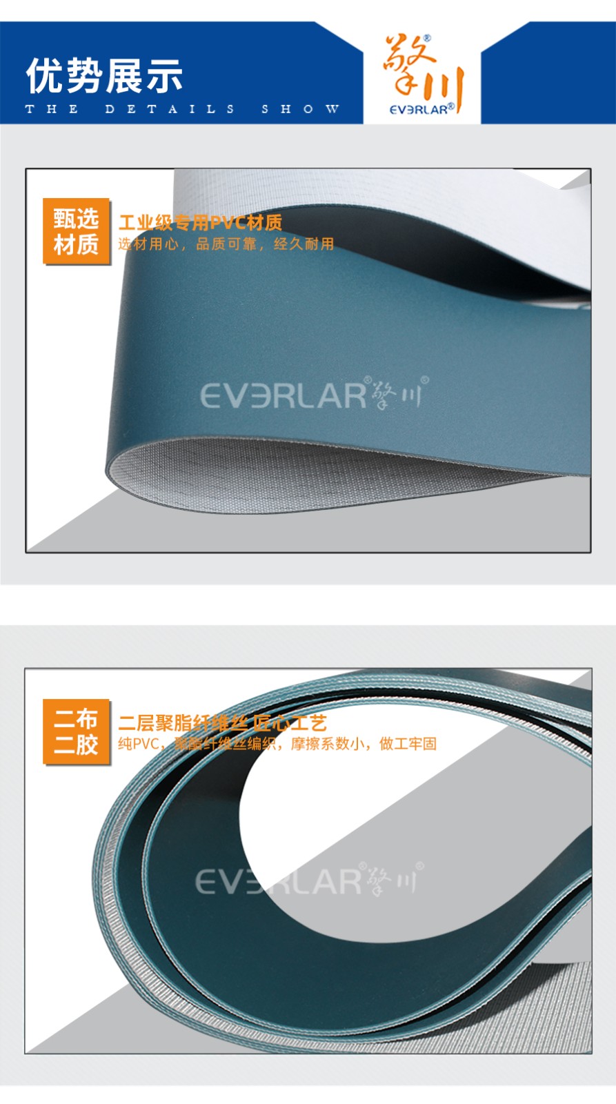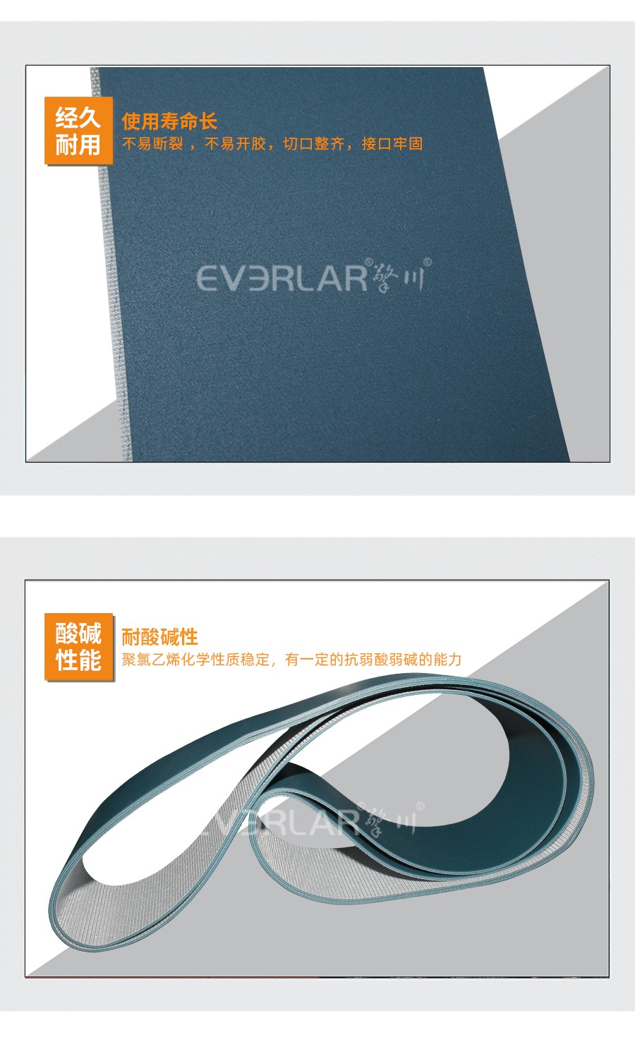 強(qiáng)度高,帶體彈性好,重量輕,無毒無異味,使用壽命長(zhǎng),耐磨性好,阻力小。