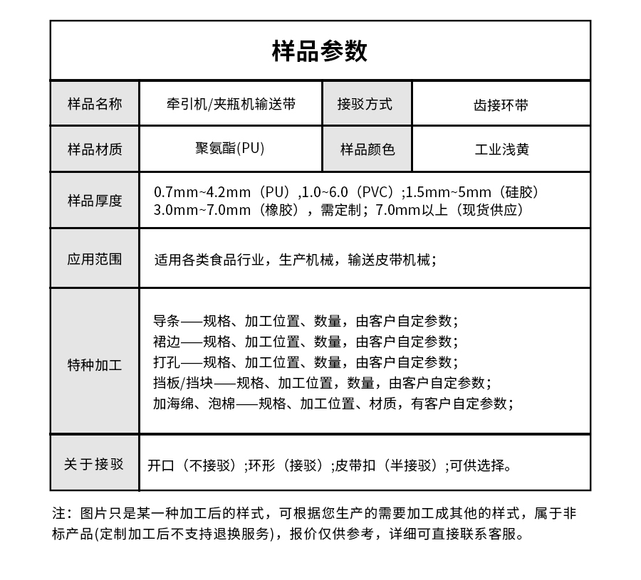 • 產(chǎn)品名稱:牽引機(jī)、夾瓶機(jī)輸送帶