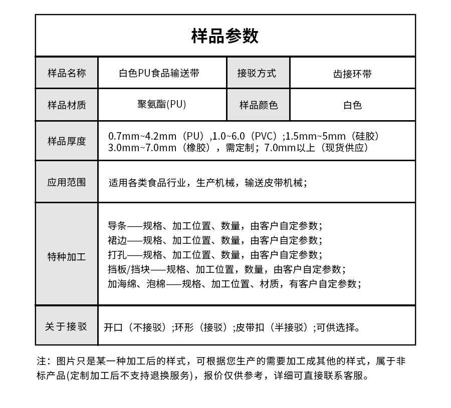 | 樣品名稱 | 白色PU食品輸送帶 | 接駁方式 | 齒接環(huán)帶 |