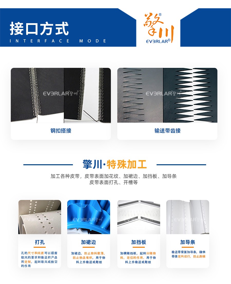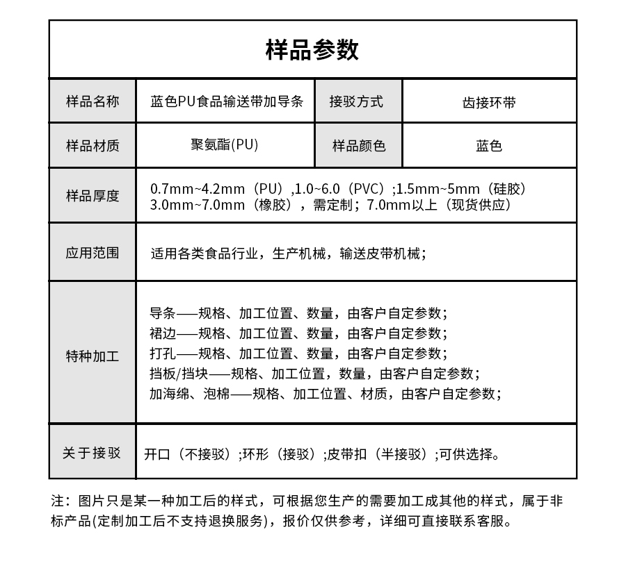 | 樣品名稱 | 藍(lán)色PU食品輸送帶加導(dǎo)條 | 接駁方式 | 齒接環(huán)帶 |