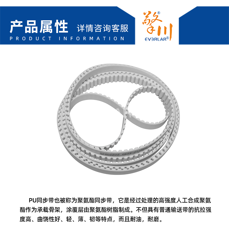PU同步帶也被稱為聚氨酯同步帶,它是經(jīng)過處理的高強(qiáng)度人工合成聚氨酯作為承載骨架,涂覆層由聚氨酯樹脂制成。不但具有普通輸送帶的抗拉強(qiáng)度高、曲饒性好、輕、薄、韌等特點(diǎn),而且耐油,耐磨。
