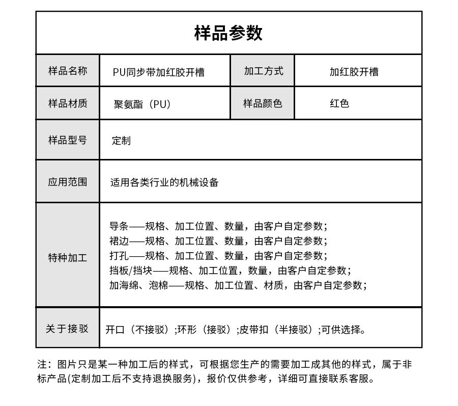 | 樣品名稱 | PU同步帶加紅膠開(kāi)槽 | 加工方式 | 加紅膠開(kāi)槽 |