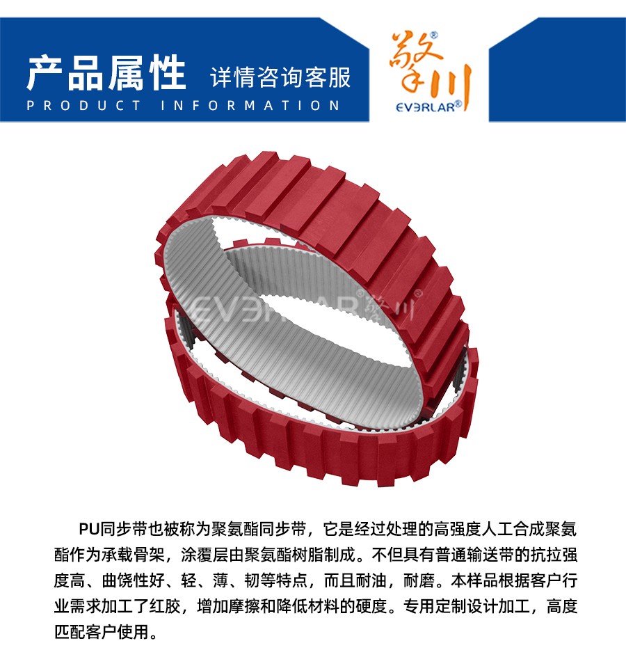 PU同步帶也被稱為聚氨酯同步帶,它是經(jīng)過(guò)處理的高強(qiáng)度人工合成聚氨酯作為承載骨架,涂覆層由聚氨酯樹(shù)脂制成。不但具有普通輸送帶的抗拉強(qiáng)度高、曲饒性好、輕、薄、韌等特點(diǎn),而且耐油,耐磨。本樣品根據(jù)客戶行業(yè)需求加工了紅膠,增加摩擦和降低材料的硬度。專用定制設(shè)計(jì)加工,高度匹配客戶使用。