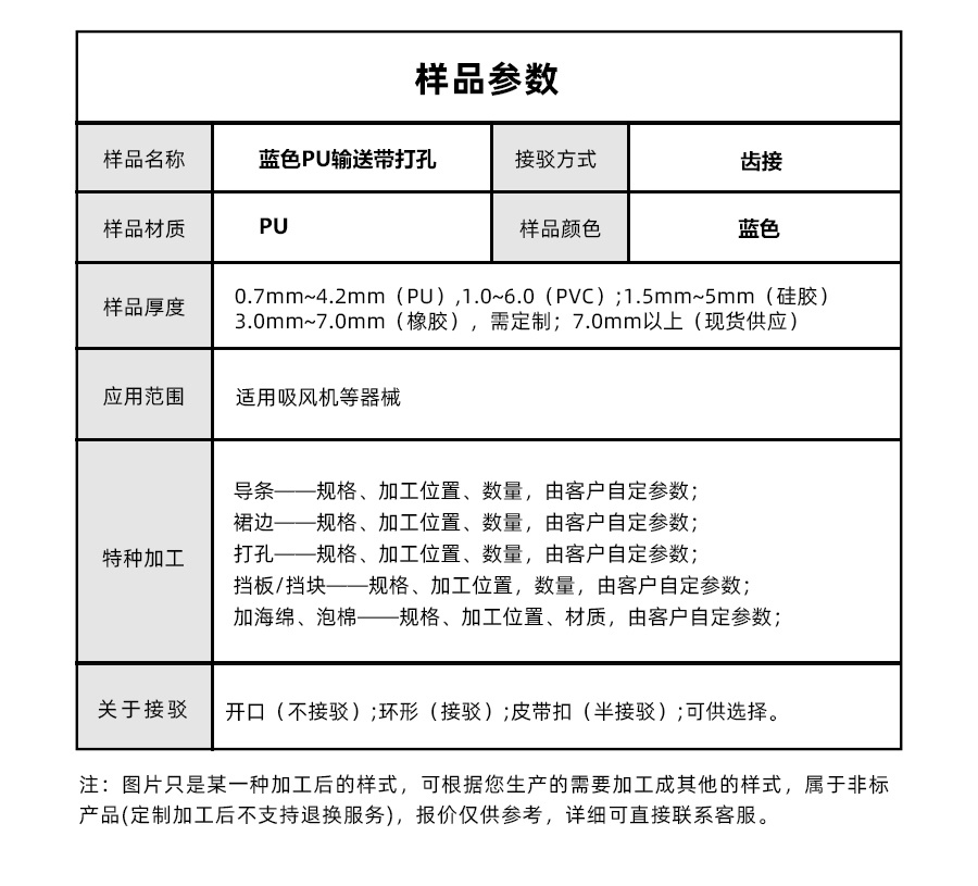 樣品名稱藍(lán)色鉆紋PU輸送帶打孔接駁方式