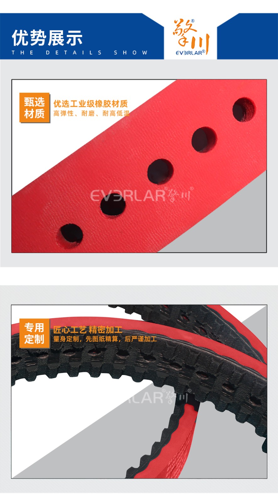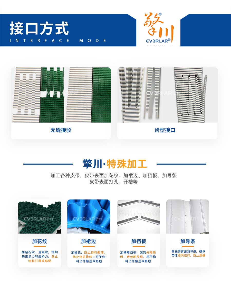 | 特種加工 | 1.底帶的選擇:橡膠同步帶或PU(聚氨酯)同步帶,均可; 2.開槽加工:底帶開槽的具體寬度、深度由客戶指定; | ||