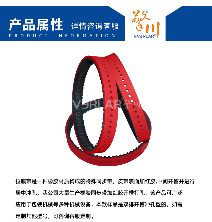 拉膜帶是一種橡膠材質(zhì)構(gòu)成的特殊同步帶,皮帶表面加紅膠,中間開槽并進行居中沖孔,我公司大量生產(chǎn)橡膠同步帶加紅膠開槽打孔,該產(chǎn)品可廣泛應(yīng)用于包裝機械等多種機械設(shè)備,本款樣品是雙排開槽沖孔型的,如需定制其他型號,可咨詢客服定制。