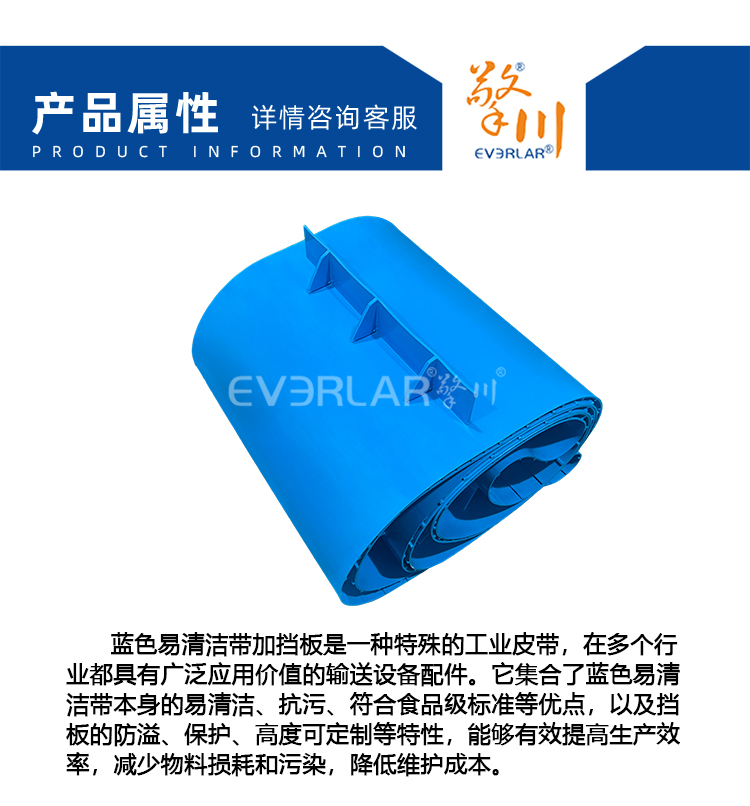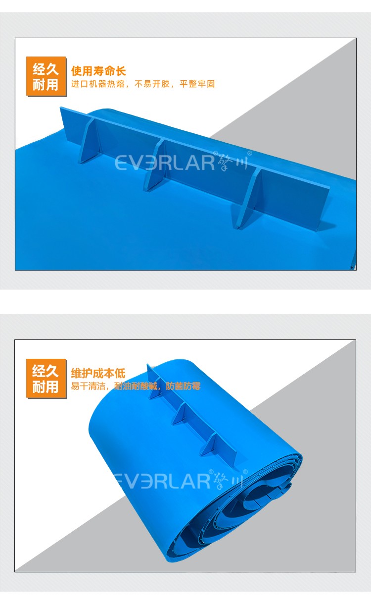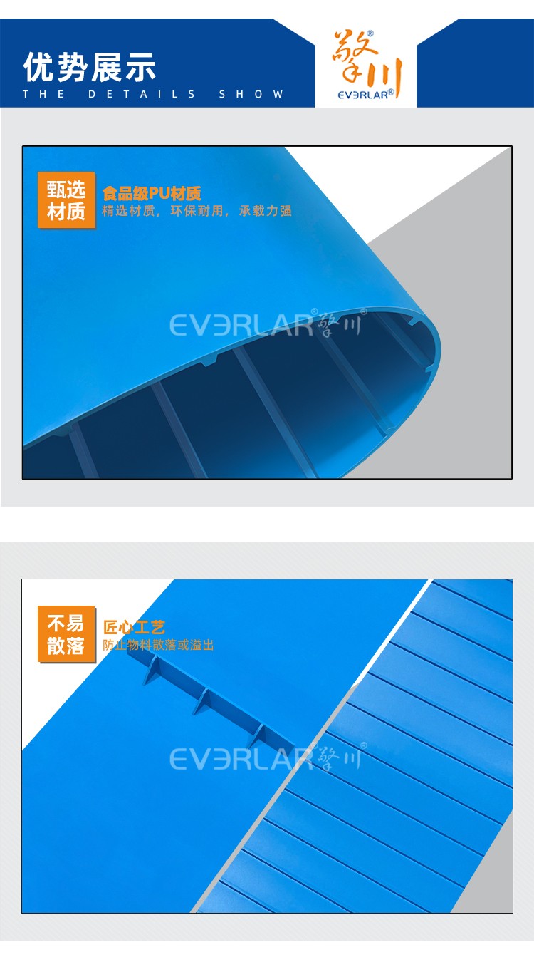 • 產(chǎn)品名稱:易清潔TPU加擋板輸送帶藍(lán)色食品級(jí)防溢抗污生產(chǎn)線設(shè)備傳送帶